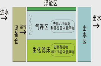 采用“氣浮+生化+過(guò)濾”三合一綜合凈化設備。設備結構原理如下: