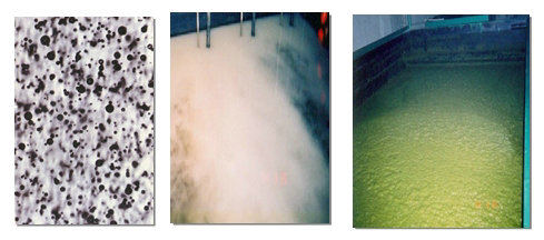 下面為氣浮運行的照片。左為顯微鏡下拍攝的氣泡上浮照片,中為設備運行初始照片(白色物為微細氣泡),右為設備運行一段時(shí)間后照片(綠色物為分離出的藻類(lèi))。