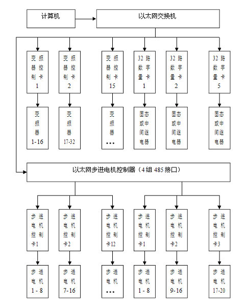 各控制辦卡全部采用以太網(wǎng)連接,最后經(jīng)過(guò)交換機連接到控制主機上,主機一般采用工控機,研華,西門(mén)子或者其他品牌均可;也可以采用市售普通家用電腦或筆記本電腦,市場(chǎng)保有量大,攜帶方便易于維修。主機與各控制板卡直接的連接如下圖所示,主機和各個(gè)控制單元采用雙絞線(xiàn)連接,便于現場(chǎng)施工,使布線(xiàn)更便捷,系統應用更加靈活。
